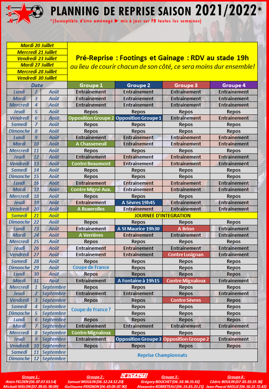 ⚽️🏃🏻♂️ Vous l’attendiez avec impatience, voici le planning de reprise pour les groupes seniors. RDV dès demain 20/07 à 19h00 au stade de la Lézinière pour la remise en condition physique.