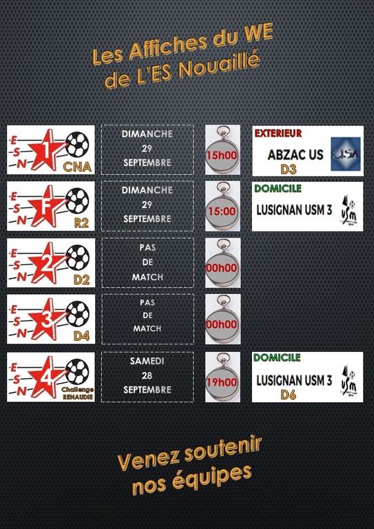 C'est tout d'abord samedi à 19h que la 4 recevra la 3 de Lusignan à l'occasion du 1er match de l'ESN en Coupe Renaudie. Il faudra confirmer le succès en championnat du we dernier !
